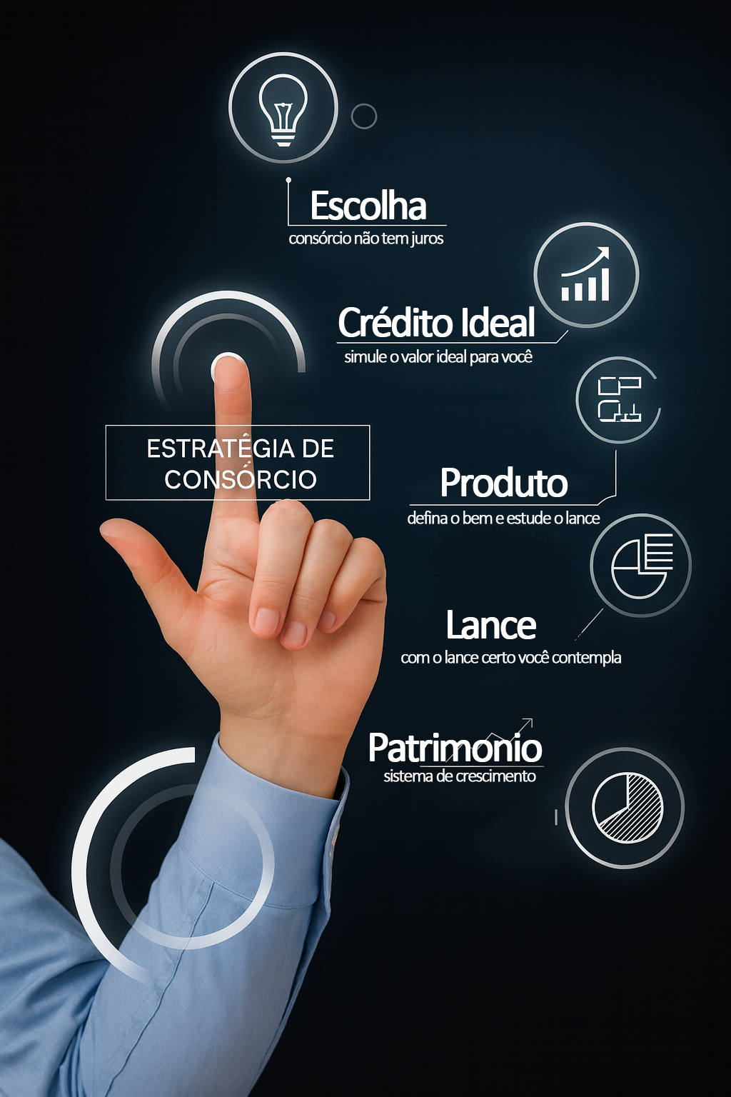No consórcio estratégico, você adquire patrimônio sem juros e com total previsibilidade. Cada etapa é planejada para que você pague menos e conquiste mais, sem os custos abusivos do financiamento.